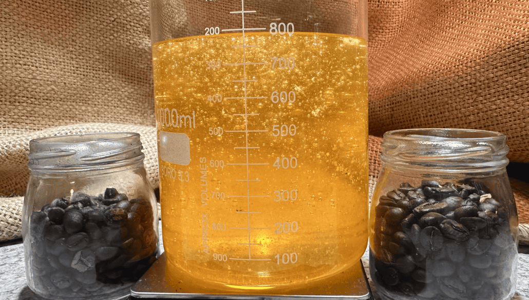 Rich coffee beans in jars with an espresso extraction process, perfect for Café Tolento's specialty coffee.